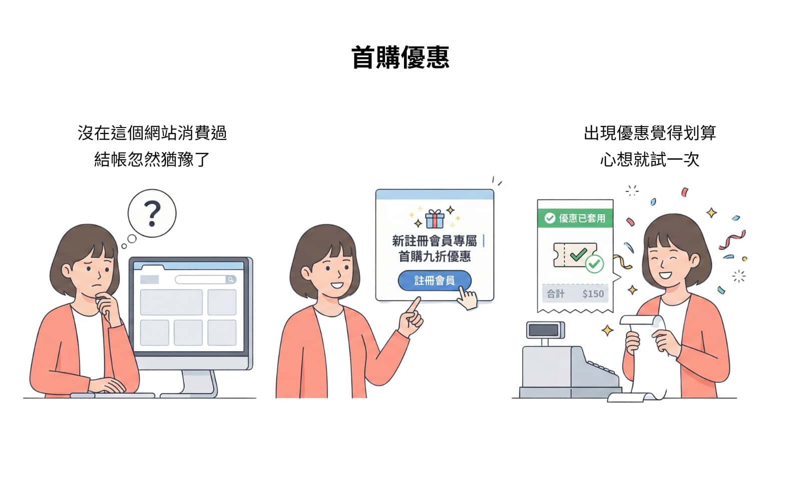與其一開始就進行大幅度促銷,不如先降低第一次消費者嘗試的風險。透過新客專屬折扣,讓消費者清楚知道「第一次購買有特別照顧」,有效推動首次購物。