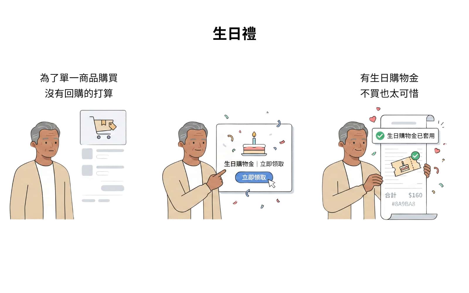 透過生日購物金設定,品牌可以在不打擾顧客的情況下,傳達關心與記憶點,讓顧客對品牌產生黏性,消費行為在情感累積後自然發生。
