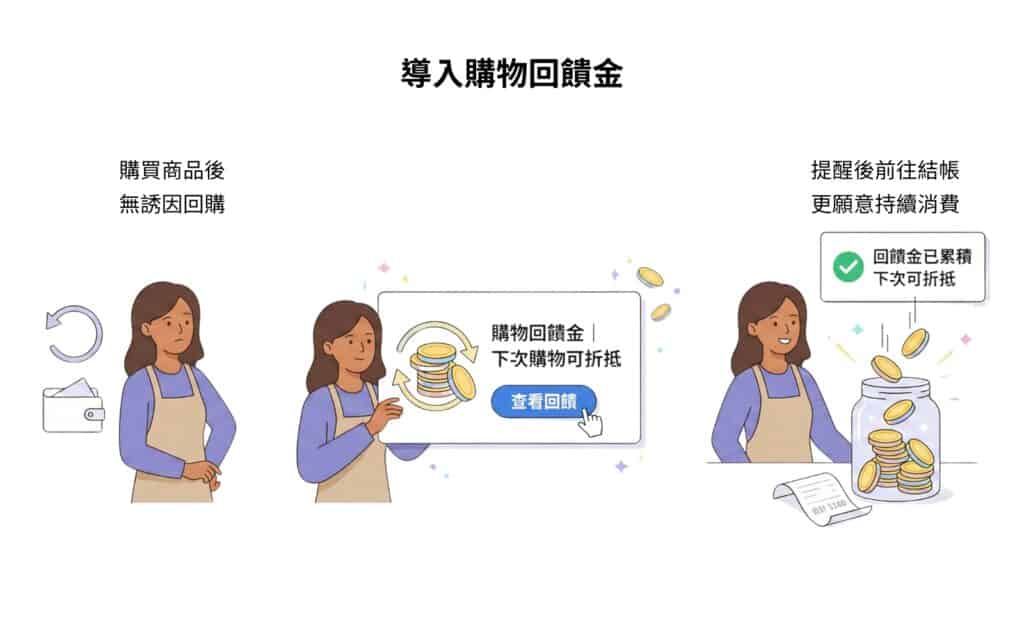 單次促銷或許能帶來訂單,但想要建立穩定的顧客回購,需要建立一個「買完之後還有理由再回來」的理由,而購物回饋金是一種溫和有效的方式。如果顧客完成付款與取貨後能拿到購物回饋金,顧客便有了回購的動機。