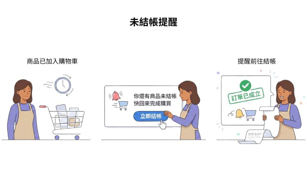 很多顧客把商品加入購物車後卻沒有結帳,有時候並不是不想買,而是剛好結帳時被打斷或忘記。透過「未結帳提醒」通知功能,其實就有機會把高意願顧客拉回來完成付款。