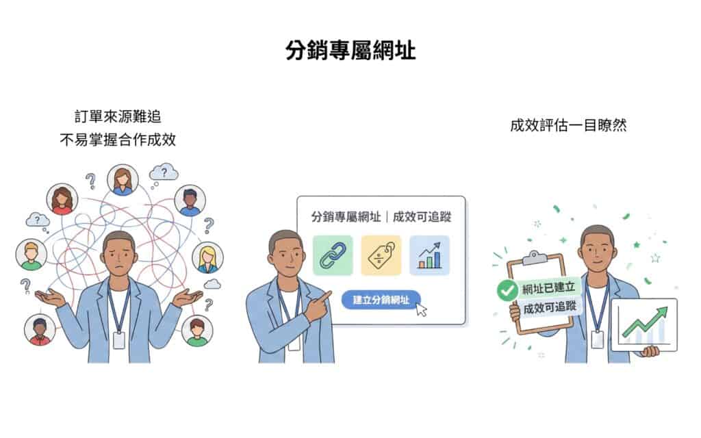 與 KOL、部落客或異業合作導流時,最怕的是「有曝光但不知道誰真正帶來訂單」。使用分銷網址可以為每個合作對象建立專屬分銷網址,系統會記錄成交訂單的來源並計算佣金,讓合作成效變得透明可量化。